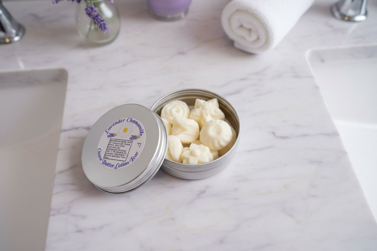 - 2 oz mini tin with 20 mini heart or donut-shaped lotion bars